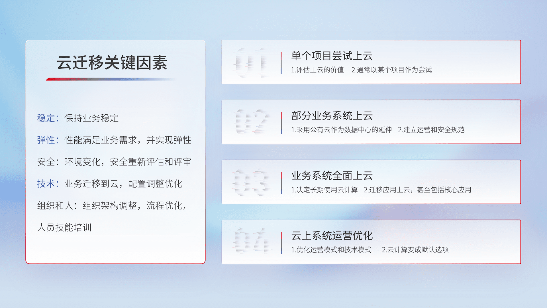 结合实际业务,,从规划设计、、云平台选型、、、云原生改造、、数据迁移、、、、集成交付,,迁移全过程为客户识别最佳上云路径,,做好风险识别管理,,设计网络架构、、、身份权限、、、、安全审计合规、、、、操作审计、、、日志审计、、监控告警策略、、多站点容灾设计等,,对云上基础设施进行整体规划,,,提升IT治理水平,,以满足弹性、、、、高可用、、、高性能的需求。。