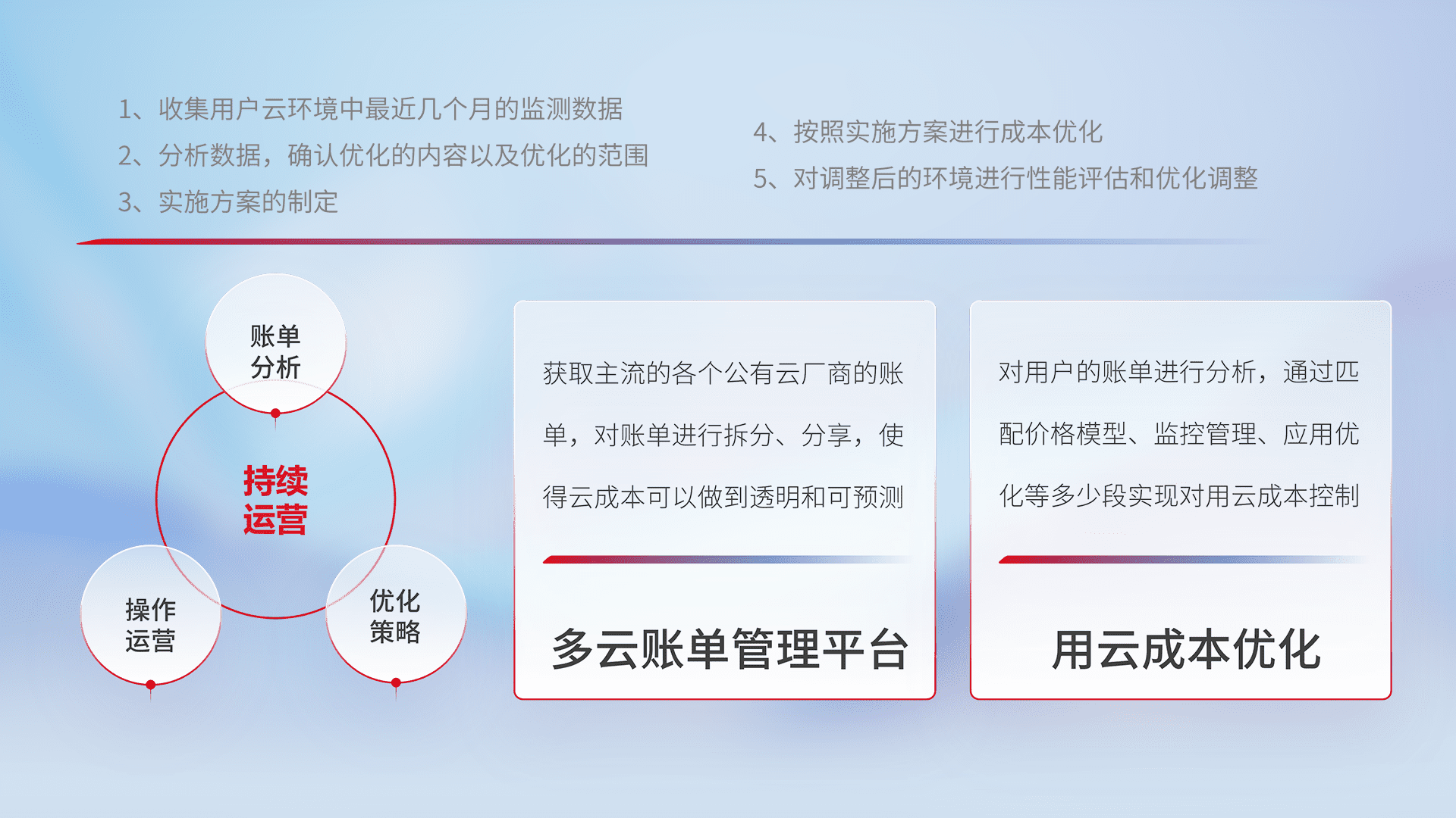 通过多云纳管,,,以统一的资源数据模型把客户的云资源进行抽象和封装,,,,进而实现对多云资源的统一操作,,保障云资源管理的可靠性、、稳定性与可用性。。量身定制化运维内容,,配置、、开发运维、、、、补丁管理、、、、备份、、监控、、、认证和访问管理、、审计和日常巡检等,,保障在用云过程中的可靠度,,,稳定度以及高可用率。。。