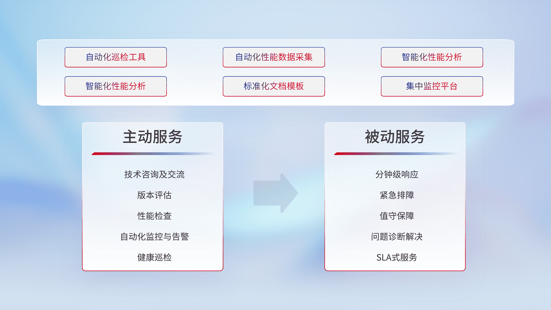 智能化工具和标准化文档,,,保障服务质量,,提供主动服务(包含技术咨询、、、版本评估、、性能检查、、自动化监控与告警、、、、健康巡检)和被动服务包含(分钟级响应、、紧急排障、、、、值守保障、、、问题诊断解决、、、、SLA服务)。。。。